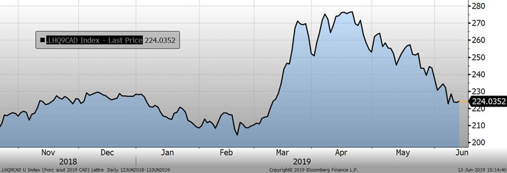 La situation a-t-elle tant changé récemment? Est-ce que cela se traduit par des prix relativement décevants pour l’été 2019? Après les baisses des prix des mois d’été durant des 2 dernières semaines, ce sont maintenant les prix d’octobre et de décembre 2019 qui ont absorbé les pertes. Les fonds et les spéculateurs ont vendu une grande proportion de leurs contrats acheteurs accumulés en mars et avril. En fait, ceux-ci ont réduit de moitié leur positionnement depuis 3 semaines maintenant. L’excitation est ailleurs dans les marchés financiers et il faut que cet argent travaille!