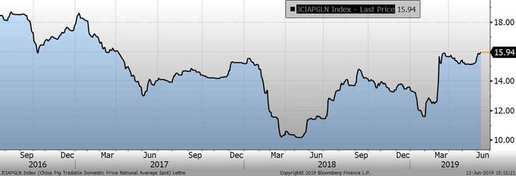 La situation porcine mondiale demeure essentiellement la même malgré tout. La Chine vient de confirmer que pour le mois de mai 2019, le cheptel de truies a connu une baisse de 23.9% par rapport à mai 2018. C’est 1% de plus que les pertes du mois d’avril. Ces pertes sont donc à la hausse. D’ailleurs les prix en Chine continuent de grimper, moins rapidement, mais sont tout de même à la hausse de presque 1% cette semaine.