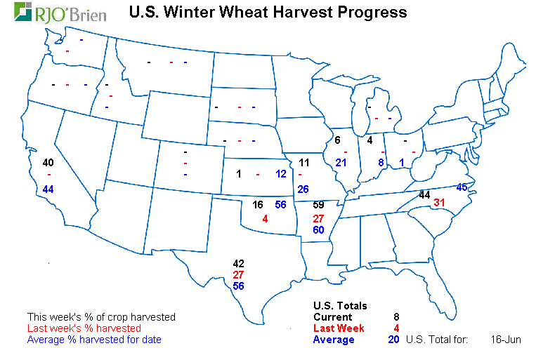 - Blé hiver : récolte en retard, 8% de fait vs 25% l’an passé ou 20% en moyenne.