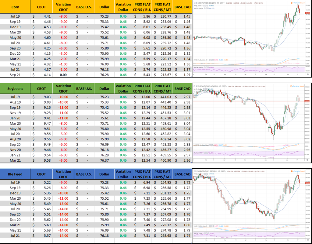 On a un marché volatile, c’est certain. Ça veut dire que des fois (souvent) les prix bougent à la hausse comme à la baisse sans trop de raisons fondamentales. Et c’est bien normal. Dans le corn on a senti de la fatigue depuis lundi avec les prix qui n’ont pas été en mesure de poursuivre le rallye. Les utilisateurs cherche à s’approvisionner mais veulent aussi attendre de voir le rapport la semaine prochaine avant de miser de plus en plus cher. Le prix récolte décembre a touché 4.73 $bu dimanche soir à l’ouverture mais depuis c’est un repli défensif de 20 cents. Il va falloir attendre à vendredi prochain le 28 juin afin d’avoir une meilleure idée de ce qui est dans le champs. Ça sera un premier jet, mais même là je ne suis pas certain s’il n’y aura pas des ajustements additionnels en cours de saison. Pourquoi? L’USDA conduit le sondage sur les semis durant les deux premières semaine de juin, ensuite ils compilent tout ça et publie l’information à la fin du mois. Le hic c’est que cette année avec le retard, je pense qu’il peut y avoir une grosse divergence entre la réponse au sondage du premier cultivateur appelé le 1er juin et le dernier appelé le 14 !