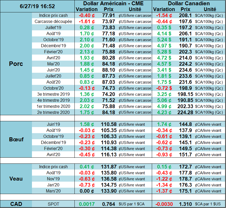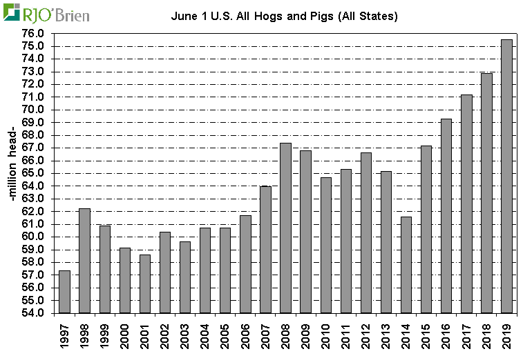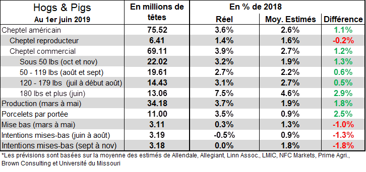 Le rapport Hogs & Pigs de l’USDA nous dévoile un cheptel record de porcs en date du 1er juin 2019. La grosse question à répondre était : d’où provient l’abondance des abattages de juin? L’USDA y a répondu d’abord en augmentation la production des trimestres précédents avec des révisions à la hausse sur la production jusqu’en septembre 2018. Notamment pour le cheptel de 50 à 119 lbs au 1er mars, l’USDA a fortement augmenté la donnée en ligne avec les abattages de juin. En conséquence, le cheptel commercial au 1er juin 2019 était de 69.11 millions têtes, soit 3.9% de plus que l’an dernier et +1.2% de plus que les attentes. Heureusement, on peut dire que le pire est dernière nous puisque la surprise se situe particulièrement dans la section 180 lbs et plus, soit les abattages de juin. Il y avait 7.5% plus de porc que l’an dernier, presque 3% de plus qu’attendu. Pour les autres classes de poids, c’est environ 3% plus de têtes que l’an dernier, légèrement au-dessus des attentes. On peut donc s’attendre à ce que les prix pour août-octobre restent sous-pression, mais ne devrait pas dégringoler suite au rapport.