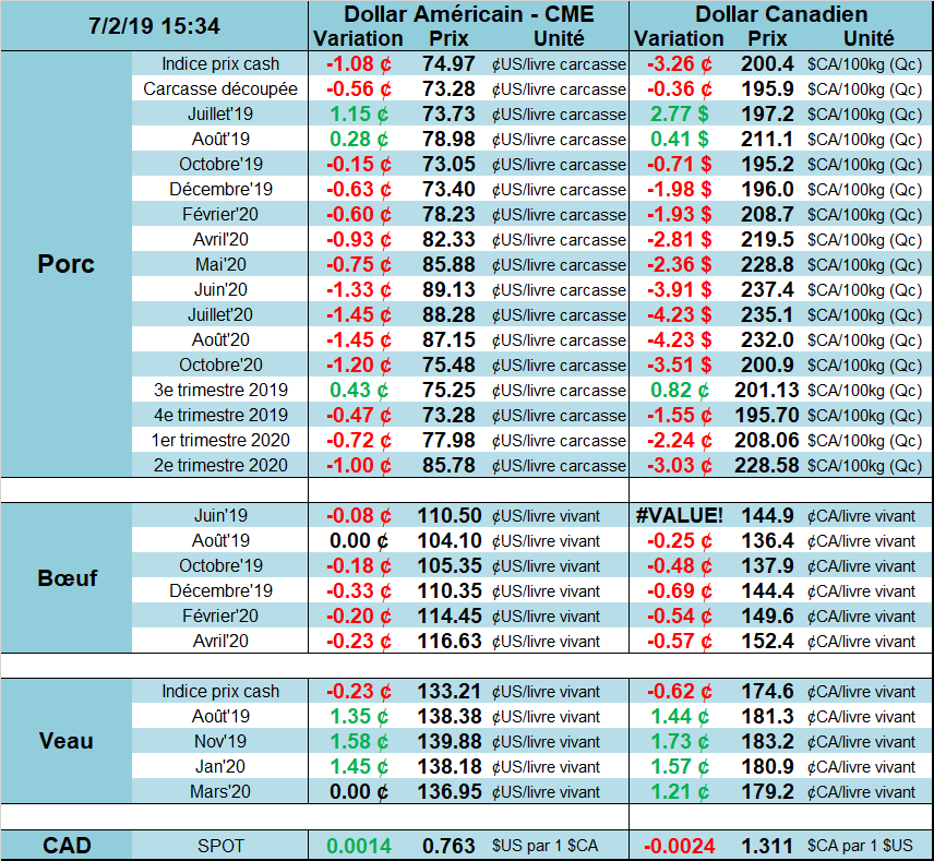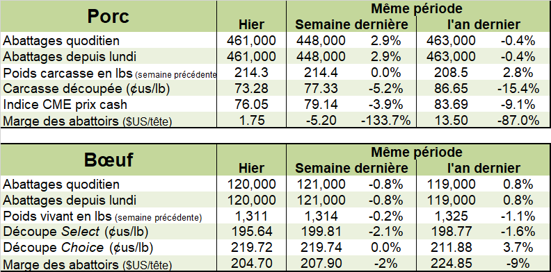 Qu’à cela ne tienne, les données publiées depuis quelques jours demeurent plutôt négatives alors que le USDA rapporte un prix au comptant à la baisse. Celui-ci se situe maintenant à moins de $74 USD / 100 livres. Le prix de la découpe continue sa descente avec une baisse de $0.56 USD / 100 livres hier. Ainsi, le prix de découpe se situe à $73.28 USD / livres. En fait, les marges des abattoirs demeurent quant à elles négatives depuis quelques temps.