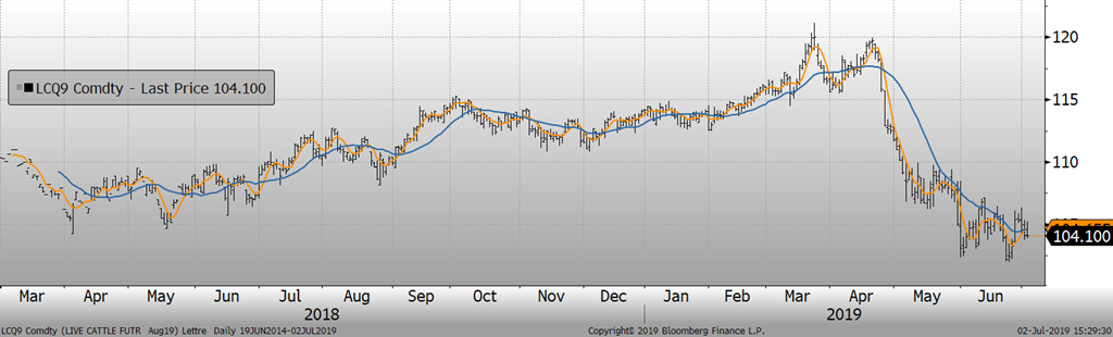 Alors que les abattages américains dans le porc dépassent toute les attentes, les données dans le bœuf sont plutôt tièdes. Le marché a abattu 2.5% plus de bœuf pendant la semaine dernière versus la même semaine en 2018. Cependant, contrairement aux abattages porcins, le poids moyen est largement sous les niveaux de l’an dernier ce qui provoque moins de viande de bœuf offert sur le marché au comptant. On parle ainsi d’une hausse de 0.8% par rapport à la même semaine de 2018.
