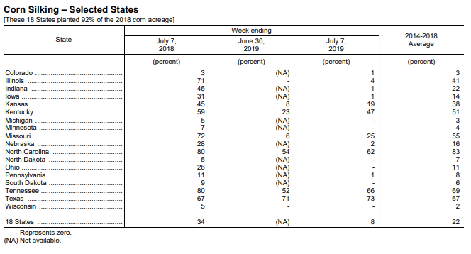 D’ailleurs on le voit, les cultures sont à certains endroits (PAS PARTOUT) clairement en retard. Les soies commencent à peine à sortir dans le Midwest. Par exemple en Illinois on estime les soies à 4% alors que normalement c’est 41% en moyenne à ce temps-ci. Bon l’Illinois c’est un exemple très évident, mais sinon l’ensemble du cornbelt est en retard quand même; 8% de soies vs 22% en temps normal.