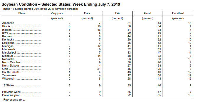 Constat similaire pour le soja. C’est incroyable de penser que l’USDA publie encore des progression de semis… EN JUILLET ! Je me demande bien qui sème des fèves rendu en juillet. Le soies de blé d’inde sont en retards, eh bien la floraison du soja aussi. Au niveau national ils sont à 10% en floraison, et normalement c’Est à 32%. Comme de fait, le soja n’est pas très beau, en baisse de 1% il est 53% bon/excellent.