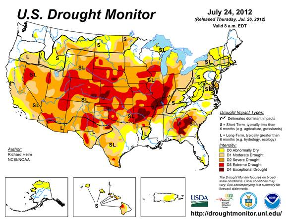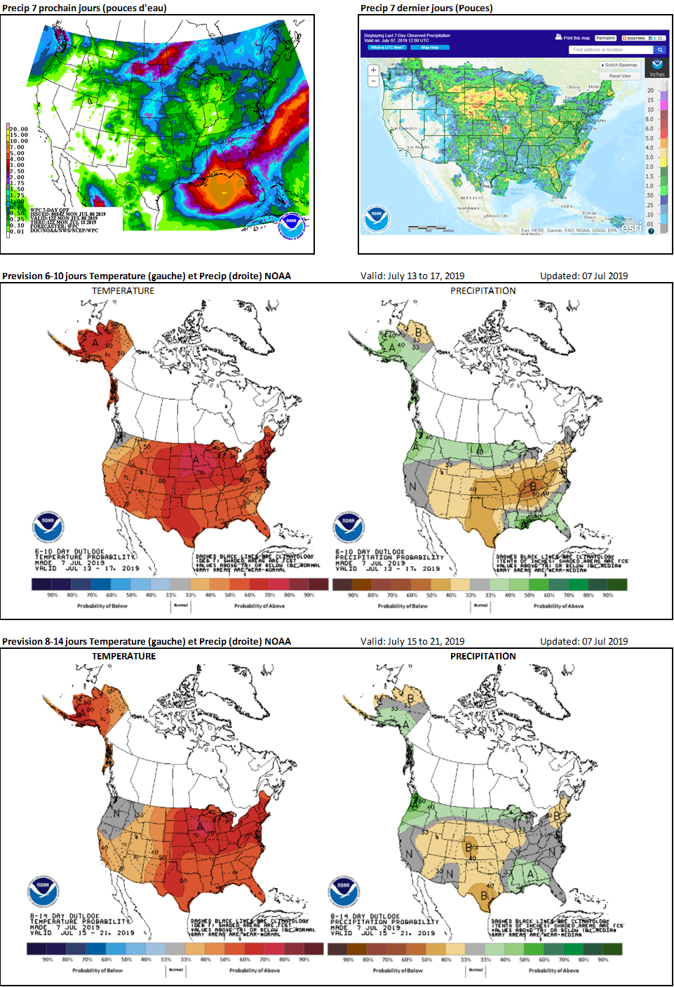 Météo…. Il annonce (enfin?) un peu de beau temps au States, normalement le temps chaud/sec est dangereux pour les cultures mais cette année les réserve d’eau sont tellement grande que pour l’instant on ne peut pas dire qu’il y a un énorme danger à court terme. Les cartes météo montrent que 0% du blé d’inde est en zone de sécheresse. Zéro.