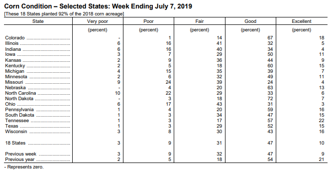 Les conditions des cultures sont « stable ». Elles ne sont pas très bonnes, mais au moins elles ne se détériorent pas plus…. Le corn est un peu mieux, le soja est un peu moins beau. Somme toute on est pas mal dans le pourcentage prévu pour les commentateurs du Midwest. Donc oui, ça ne s’empire pas, mais ça ne s’améliore pas non plus…. Je veux dire, pour la peine. 1% c’est 1% on me diras….