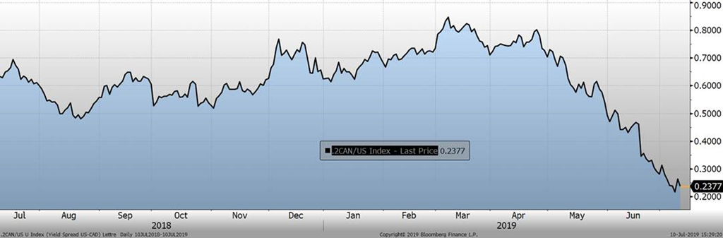 On note un changement drastique du rendement des obligations américaines depuis 9 mois, indicateur de la force/faiblesse d’une devise. En octobre et novembre, le rendement sur les obligations américaines 2 ans était de 2.90%, soutenu par l’anticipation de voir des politiques monétaires restrictives (hausses de taux) aux États-Unis. Maintenant, on est rendu à 1.82% de rendement! Relativement au rendement des obligations canadiennes 2 ans, l’écart était de 0.8% en mars (rendement des obligations US > Canada) et s’est férocement corrigé depuis, pour atteindre 0.20% cette semaine. Malgré le fait que le taux directeur est 0.65% en-dessous du taux de la FED, le marché offre une prime de seulement 0.20% sur un investissement aux États-Unis pendant 2 ans ce qui démontre le pessimiste face aux taux États-Unis… ainsi qu’à l’économie américaine.