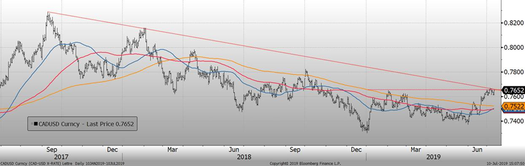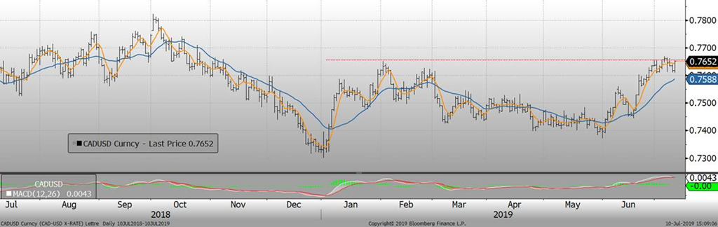 À 10h00, la Banque du Canada (BdC) publiait son taux directeur lequel demeure à 1.75%, tel qu’anticipé par le marché. Bien que l’économie canadienne se remet des difficultés éprouvées à la fin 2018 / début 2019, ce qui a permis à la BdC d’augmenter récemment les perspectives pour la fin de l’année 2019, l’économie mondiale continue d’inquiéter. Le ton utilisé par Poloz, gouverneur de la Banque du Canada, était plus prudent que dans ses derniers discours ce qui à fait reculer le CAD après l’annonce à 10h00, mais ce fût de bref et le CAD est retourné dans les hauts de la journée en après-midi.