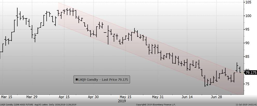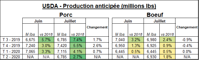 Ce midi, l’USDA publiait son rapport mensuelle d’offre et demande des biens agricoles. Pour le porc, la production des prochains trimestres ont été revue à la hausse. Au 3ème trimestre, malgré des prévisions en juin à +5.7% versus 2018, elles ont été revues à la hausse à 7.4% de plus qu’en 2018. Il y aura donc beaucoup de production cet été! Au 4ème trimestre, l’USDA a réévalué la production à 7.4 milliards de lbs, soit 2.6% de plus que les anticipations de juin ou 5.5% de plus que l’an dernier… ça va faire beaucoup de porc pour le temps des fêtes. Pour 2020, l’USDA prévoit une production annuelle de 28.4 milliard de lbs ce qui représenterait une augmentation de 2.7% versus cette année. Malgré le fait que l’USDA prévoit une augmentation des exportations de porc par +8% l’an prochain, l’offre de porc par habitant augmentera de 52.3lbs à 52.5lbs.