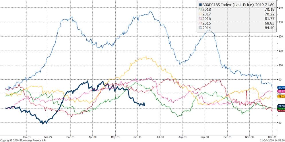 Les données d’exportations étaient très décevantes ce matin alors que le USDA annonçant des ventes conclues qui se situaient à 11 300 tonnes métriques. C’est peu, trop peu tenant compte des espoirs énormes qui pèsent sur ce produit pour la fin de l’année 2019. Les contrats à terme anticipent nettement des hausses des exportations. Chaque semaine qui passe fait diminuer les espoirs de bons prix et les futures se dégonflent tranquillement sur les échéances éloignées.