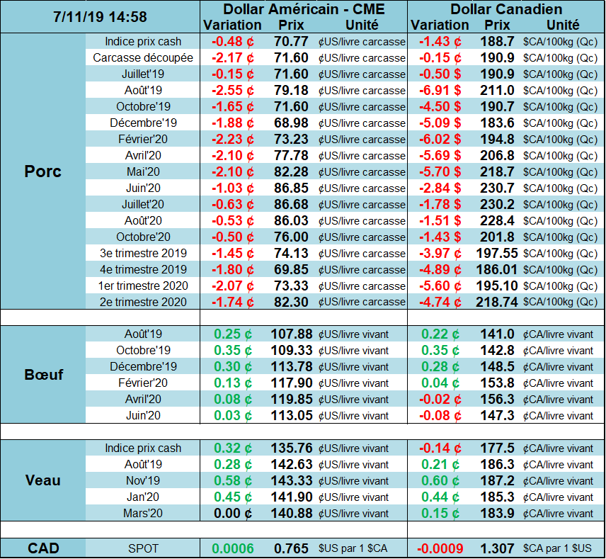 Encore une fois le cœur de la débandade demeure la faiblesse du prix de la découpe. Hier encore, celle-ci perdait $2.17 USD / 100 livres pour se situer à 71.60 USD / 100 livres et baissait de $1.40 ce matin à seulement 70.20. Ce prix demeure sans nul doute le pire depuis des 10 dernières années pour un mois de juillet. Le prix au comptant vient de tourner de sens alors que la plus récente publication du USDA faisait état d’une hausse de 0.09 USD / 100 livres. L’indice au comptant se situe maintenant à 70.69 USD / 100 livres.