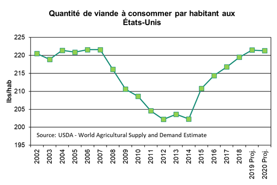 Dans le bœuf, l’USDA a légèrement abaissé ses prévisions de production pour la 2ème moitié de 2019. L’augmentation de production du 3ème trimestre devrait être 2.4% de plus que l’an dernier alors que le 4ème trimestre, c’est seulement +0.9% de croissance. La hausse de la production dans le bœuf est nettement inférieur à celle qu’on observe dans le porc. Pour 2020, la production annuelle est prévue à 27.5 milliards de livres, soit 1.1% de plus qu’en 2019. Cette croissance est moindre que celle de la demande ce qui fait légèrement diminuer l’offre de bœuf par habitant de 57.6 à 57.5 lbs/habitant.