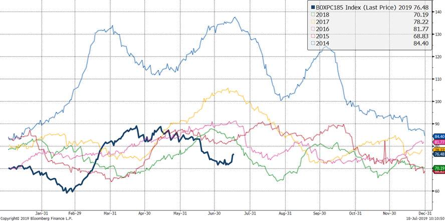 Cependant, toujours pas de signe d’achat massif de la Chine dans les données d’exportation de ce matin. Malgré des ventes de 30,100 tonnes, la Chine a rien acheté. Cependant, on note des achats de 8,200 tonnes par Taiwan et 2,300 tonnes par Hong-Kong. Le principal acheteur était la Mexique avec 8,800 tonnes. Au niveau des livraisons, la semaine du 11 juillet était celles avec le plus gros volume exporté depuis juin 2015 à 36,761 tonnes. Le fait que la viande quitte le sol américain devrait aider le prix cash.