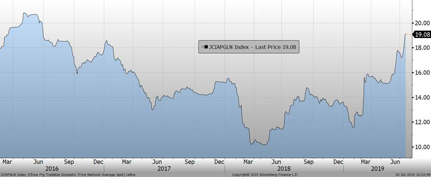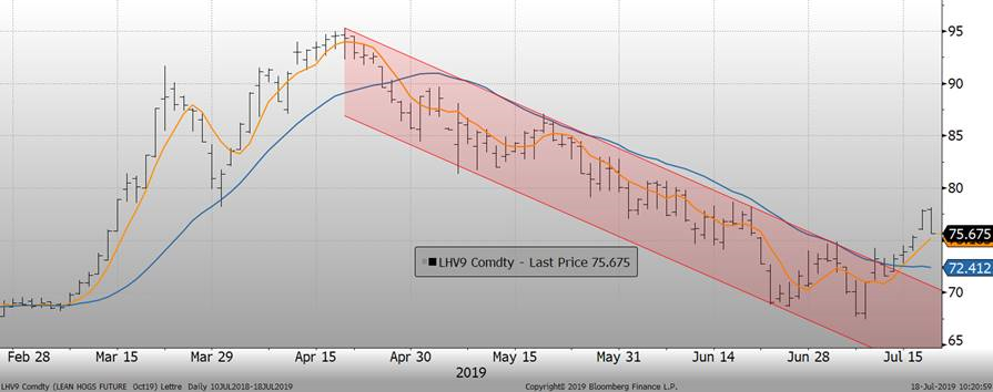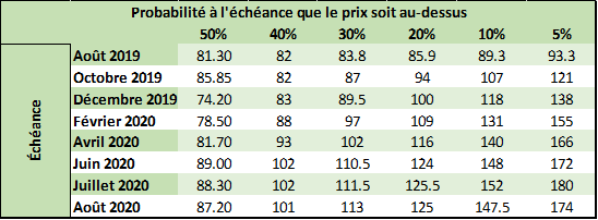 Pendant ce temps, le prix du porc en Chine fait de nouveau sommet à plus de 19 CNY/kg. Depuis le creux de février dernier, le prix a augmenté de 64% en 5 mois. Rien ne semble indiquer un signe de ralentissement et c’est aussi un facteur qui explique le récent rebond des prix à Chicago. Plus le prix monte en Chine, plus l’espoir de voir la Chine acheter du porc US refait surface. En conséquence, le marché à terme maintient une forte probabilité de voir les prix US exploser ces prochains mois. Implicitement dans le marché des options, on voit que le marché détermine qu’il y a une chance sur 10 que les prix surpassent 107, 118, 131 et 140 cents la livre pour les échéances d’octobre, décembre, février et avril respectivement. Même qu’il y a 5% de probabilité d’être à 180 cents/lb en juillet 2020, c’est plus du double de cette année…