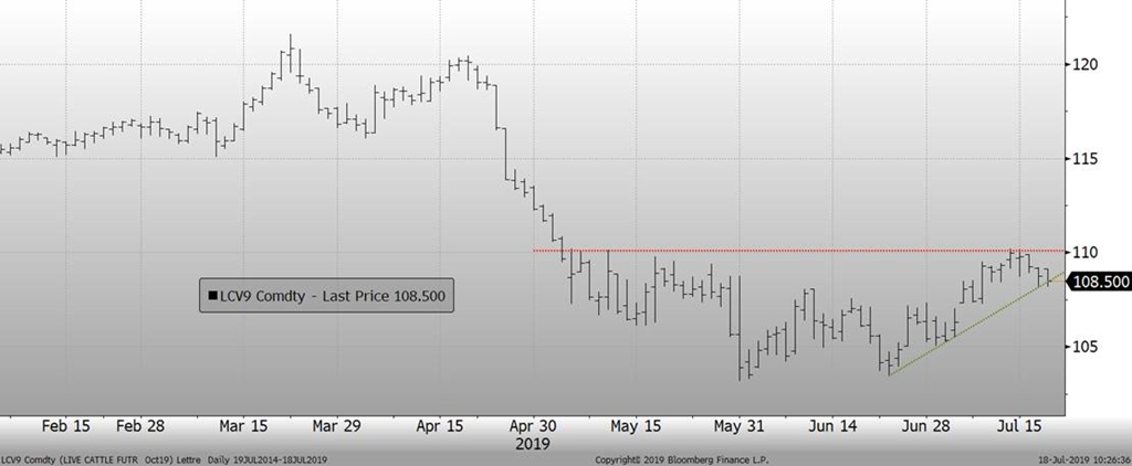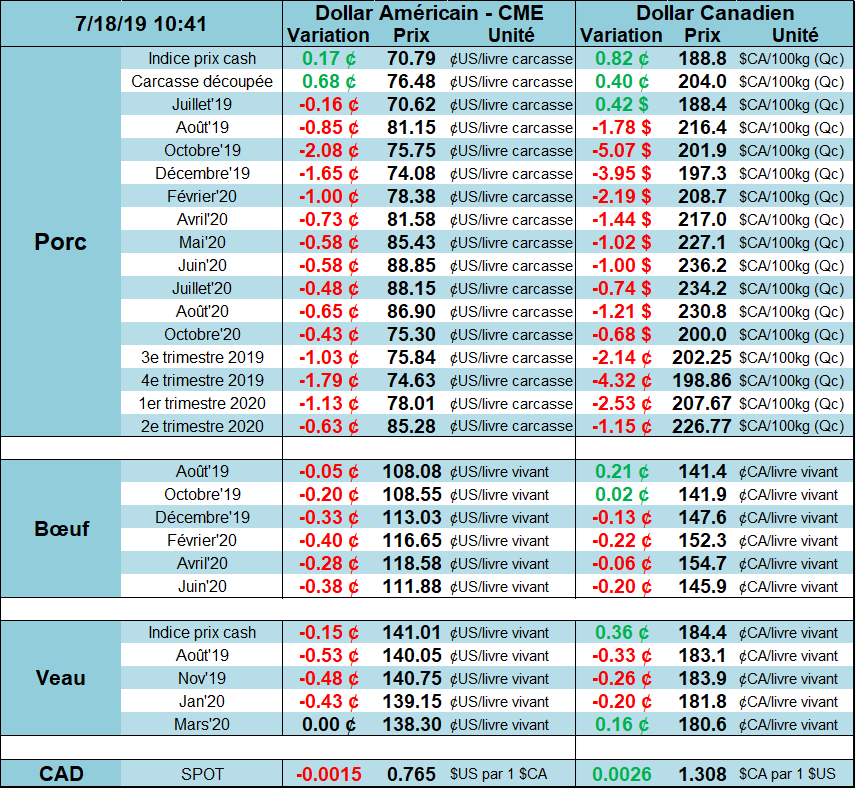 Le prix a reculé hier après d’avoir frapper la résistance de 110 cents sur octobre, principalement sur une perte du momentum (technique), mais la fermeté du prix cash et l’augmentation du prix du porc sont venus atténuer la correction. Considérant la réduction de production à venir ces prochains mois ainsi qu’une contraction plus importante que la normale entre la production du 4ème trimestre de 2018 et le 1er trimestre de 2019, le potentiel haussier sur les CàT de février semble intéressant. On peut aussi parler d’un potentiel intéressant sur avril 2020 puisque la très bonne condition des pâturages devraient restreindre les placements en parc ces prochains mois, particulièrement à l’automne, ce qui devrait occasionner une plus petite production pour la première moitié de 2020.