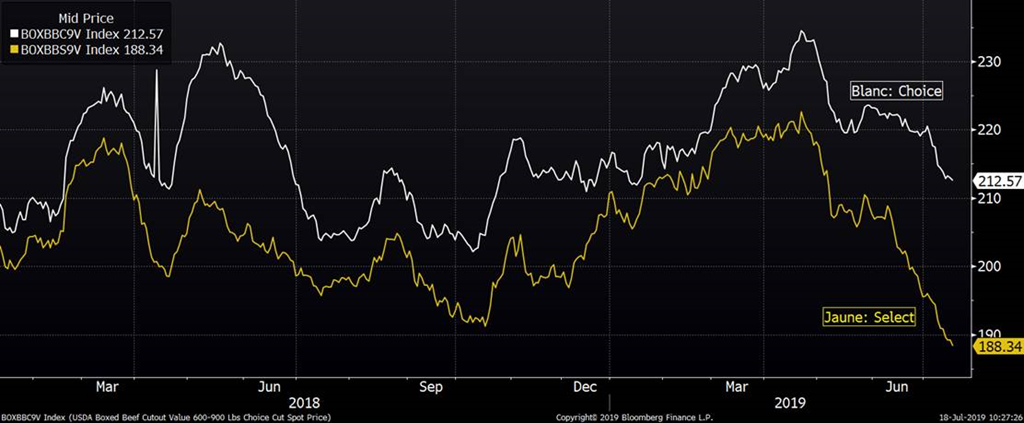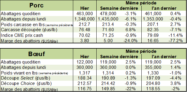 Cependant, le prix des découpes Select ne parvient pas à rebondir. Après une chute de plus de 30 cents en 3 mois, le prix du Select touchait un nouveau bas à 188 cents/lb hier. À l’opposé, le prix cash se maintient dans la fourchette du 110 – 111 cents/lb, en ligne avec les prix de la semaine dernière. Les abattages d’hier était de 122,000 têtes ce qui amène le total de la semaine à 360,000 têtes, inchangés versus la semaine dernière et un peu plus que les 354,000 têtes de l’an dernier.