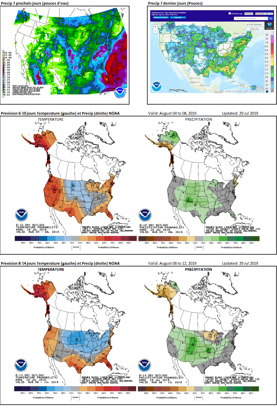 Cartes Météo : certaines régions du Midwest pourrait prendre une journée de pluie, mais les cartes de sécheresse ne sont pas en train de beeper et flasher comme en 2012. Les forecast sont quand même clément jusqu’à la mi-août avec une absence de chaleur extrême. Coté précipitation, comme je le disais, ça ferait pas de mal un p’ti nuage.