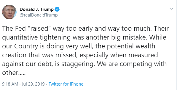 Par contre, Donald veut baisser les taux et ne se gêne pas pour s’ingérer dans les politiques monétaires. C’est du jamais vu qu’un Président se mêle (critique… ou même envoie promener pour rester poli) des politiques monétaires et du rôle des Banques Centrales. En fait, l’indépendance entre le gouvernement élu et les banques centrales est justement pour garder l’équilibre et faire en sorte qu’il n’y ait pas de dérapage. M’enfin, avec Donald tout est possible et chaque jour qui passe est du « jamais vu ».