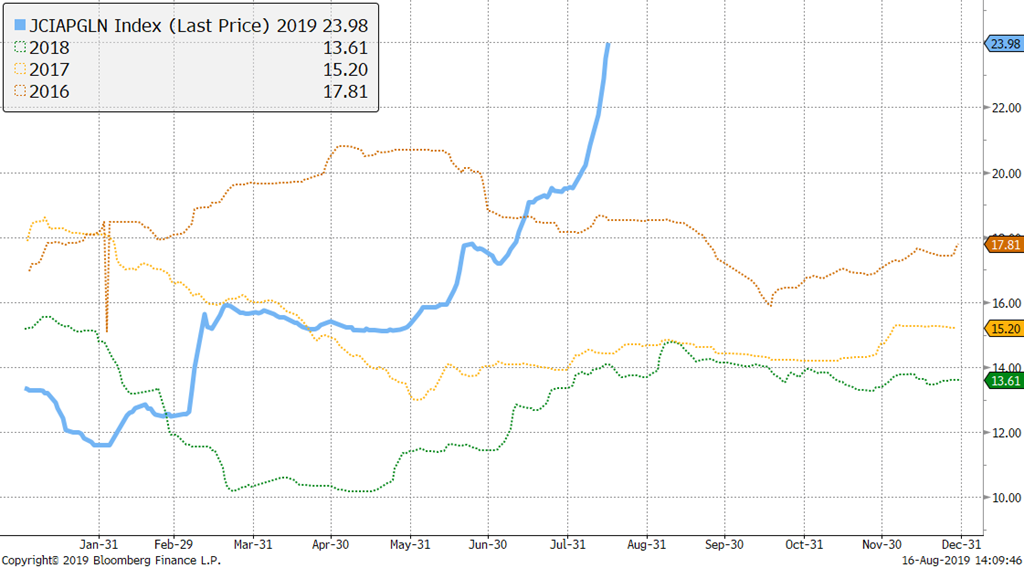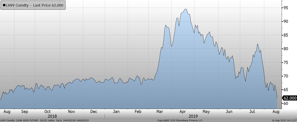 Malgré toutes ces nouvelles, le prix des contrats à terme sur le CME vivote et même baisse depuis plusieurs jours maintenant. On blâme la production américain supérieure aux attentes (43 000 porcs abattus de plus qu’en 2018 cette semaine), le manque de vigueur des exportations qui se sont chiffrées à 20 400 tonnes métriques dans le rapport du USDA d’hier. Globalement, c’est même toute la courbe de prix dans le porc qui subit une baisse généralisée (jusqu’en octobre 2020). On enlève progressivement tout l’optimisme du printemps dernier sur les prix futurs au même moment où tous les analystes prédisent que les importations chinoises seront plus fortes pour terminer l’année 2019.