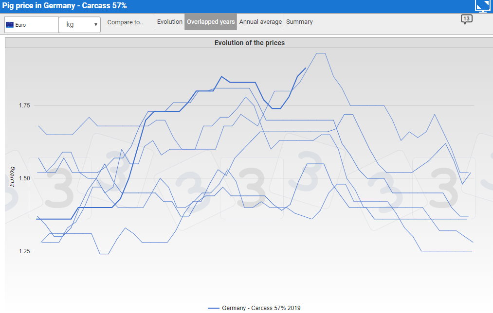 Un rapport du groupe ISN en Europe (allemand, https://www.schweine.net/news-pool-mitglieder/eu-schweinepreise-knappe-versorgungslage-notierung.html) propose une lecture intéressante des prix sur le Vieux continent. En effet, selon ce rapport, il semble que les prix offerts pour les porcs vivants sont en forte hausse en cette fin d’été. Le nombre limité de porcs disponibles provoquent des fermetures partielles d’abattoirs. Le rapport n’est accessible qu’aux membres (payant) donc il est difficile d'avoir plus de détail sur leur conclusions/hypotheses. J'ai pu trouver une référence que le prix allemand est en hausse, mais comme ici les prix sont très saisonnier (il ne faut pas comparer le prix à l'automne avec le prix à l'été), Tout de meme, les prix actuels (carcasse) sont les plus élevés des dernières années - lignes bleue foncée.