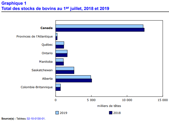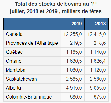 Le 1er juillet 2019, les agriculteurs canadiens avaient 12,3 millions de bovins dans leurs fermes, en baisse de 1,3 % par rapport au 1er juillet 2018. Les stocks étaient de 27,4 % inférieurs au sommet atteint en juillet 2005.