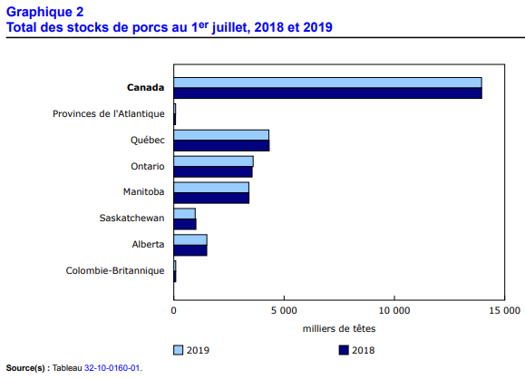 Les producteurs de porcs ont fait état de 14,0 millions de porcs, en baisse de moins de 0,1 % par rapport au 1er juillet 2018. Il s'agit d'une deuxième baisse consécutive d'une année à l'autre. Cependant, le niveau des stocks de porcs est demeuré 10,8 % plus élevé que celui de la décennie précédente.