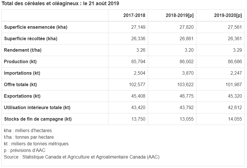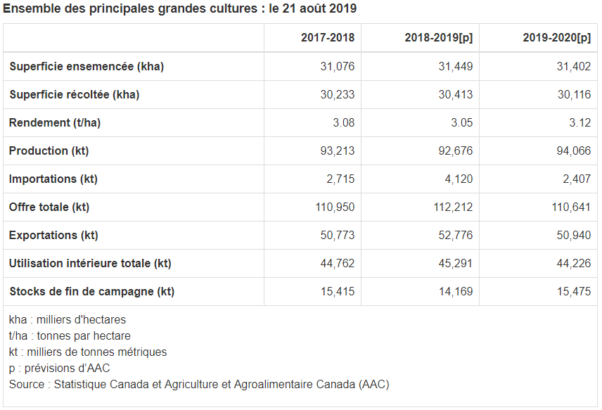 Pour 2019-2020, les estimations des superficies ensemencées sont fondées sur la diffusion de l'Enquête sur les superficies ensemencées de Statistique Canada du 26 juin, qui indique une légère diminution de la superficie totale ensemencée en grandes cultures au Canada par rapport à 2018-2019. Les prévisions d'AAC pour les superficies récoltées sont fondées sur les tendances historiques. Pour toutes les cultures, on a supposé des rendements moyens ou tendanciels, étant donné l'amélioration des conditions de croissance vers le milieu de l'été, puisque les conditions d'humidité se sont améliorées dans l'Ouest canadien en raison de pluies dispersées, tandis que l'Est du Canada s'est asséché en raison du réchauffement de la température. AAC prévoit une augmentation de 1 % de la production totale, mais une diminution de l'offre de 1,4 % attribuable à la diminution des stocks de fin de campagne et des importations. Les stocks de fin de campagne devraient croître d'environ 9,2 % en raison de l'augmentation des stocks de fin de campagne de céréales secondaires et de pois secs. Les cours mondiaux des grains continueront de subir des pressions à la baisse en raison de l'abondante offre de grains à l'échelle mondiale, mais l'impact sur les cours des grains au Canada continuera d'être atténué par la faiblesse du dollar canadien.