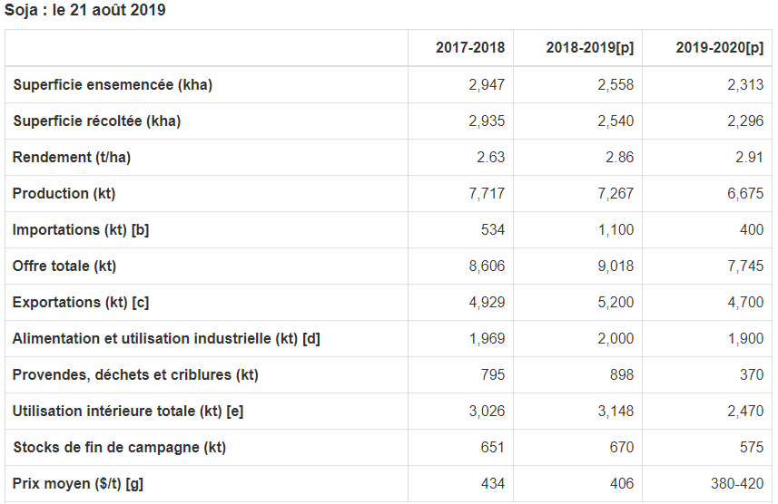En 2019-2020, l'USDA a sondé de nouveau les agriculteurs et a révisé son estimation de la superficie ensemencée de soja à 76,7 millions d'acres, une baisse par rapport à l'estimation précédente de 80 millions d'acres, et une diminution marquée par rapport aux 89,2 millions d'acres ensemencées en 2018-2019. La production devrait atteindre 3,7 milliards de boisseaux comparativement à l'estimation de juillet de 3,9 milliards de boisseaux et à la production des dernières années de 4,5 milliards de boisseaux. Les stocks de fin de campagne des États-Unis sont estimés à 0,76 milliard de boisseaux, par rapport à 0,82 milliard de boisseaux en juillet et à 1,07 milliard de boisseaux en 2018-2019, en supposant une légère hausse des triturations intérieures et des exportations. Les prix du soja américain prévus sont de 8,40 $ US le boisseau, comparativement à 8,40 $ US le boisseau en juillet, à 8,50 $ US le boisseau en 2018-2019 et à 9,33 $ US le boisseau en 2017-2018.