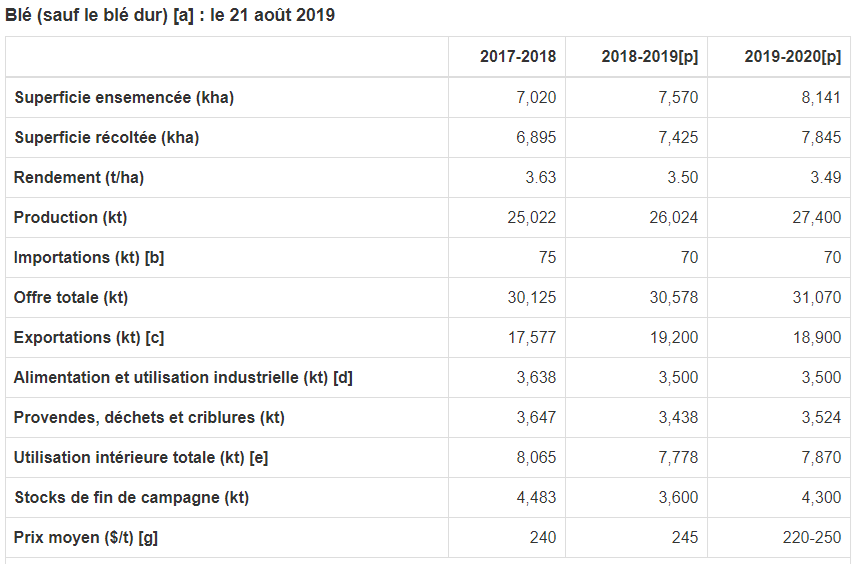 Voici la superficie ensemencée prévue par classe de blé, avec la superficie de 2018-2019 entre parenthèses :