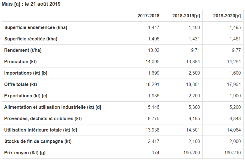 La production américaine de maïs pour 2019-2020 devrait chuter de 3,6 % par rapport à 2018-2019 en raison d'une diminution du rendement, d'après le rapport d'août sur l'offre et la demande de l'USDA. On prévoit que le prix à la ferme moyen du maïs aux États-Unis atteindra 3,60 $ US le boisseau, ce qui demeure inchangé par rapport à 2018-2019. La production de maïs chez d'autres grands exportateurs mondiaux demeure abondante en Argentine et au Brésil, et on s'attend à ce qu'elle augmente en Russie et en Ukraine, ce qui devrait influencer les prix du maïs.
