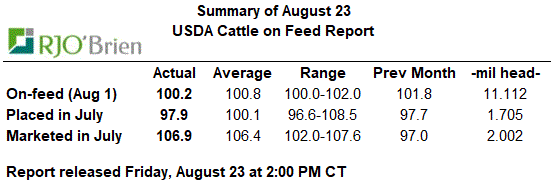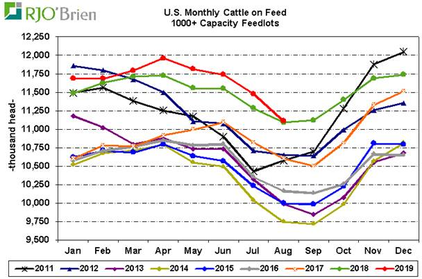 Vendredi après la fermeture des marchés, l’USDA publiait le rapport Cattle-on-Feed lequel démontrait beaucoup moins de placements que prévus. Cela s’explique fort possiblement par la très bonne condition des pâturages aux États-Unis suite au printemps pluvieux. On pense toujours que la disponibilité de bœuf vers la fin du 1ertrimestre de 2020 sera limitée et offre un potentiel haussier sur les contrats de février et avril 2020. Concernant le résultat du rapport, les placement était 2.1% moins qu’en juillet 2018 alors que le marché s’attendait à la même quantité. La commercialisation était 6.9% plus élevé que l’an dernier versus des attentes de +6.4%. Avec moins de placement et plus de sortie, inévitablement, la quantité de bœuf en parc est moindre qu’anticipée. Au 1er août, il avait 11.11M têtes en parc d’engraissement aux États-Unis, en hausse de 0.2% versus l’an dernier.