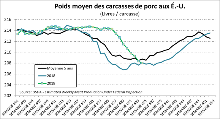 Concernant la production de la semaine dernière, les États-Unis ont abattu 2.53 millions de porc, soit l’une des plus grosses semaines de l’année jusqu’à maintenant. Ce volume est 0.3% plus élevé que l’an dernier. Aussi, on voit le poids qui continue à chuter, restreignant la production. C’est la première fois depuis le printemps que le poids des carcasses est au même niveau que celui de l’an dernier, soit 208 lbs/carcasse. En conséquence, la production était de 525.8 millions de livres, à peine 1M de plus que l’an dernier (+0.2%).