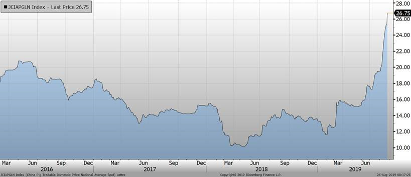 Le marché porcin chinois commence à chauffer. Le prix cash montait de 5.8% cette nuit (+1.46 CNY/kg) à 26.75 CNY/kg. En équivalent $US, c’est 382 $US/100kg! La pénurie de viande de porc se fait de plus en plus ressentir en raison de l’énorme trou de 32% dans le troupeau. Ce qui est aussi inquiétant, c’est l’accélération à laquelle le cheptel chinois rétrécie. Nous étions à -26% en juin pour chuter à -32% en juillet. Évidemment, l’explosion du prix rend l’élevage très profitable pour ceux qui n’ont pas été affectés par la PPA, principalement les grosses fermes porcines dont les mesures des biosécurités sont mieux que les éleveurs de 500 porcs/an et moins. On devrait voir beaucoup d’investissement prochainement pour augmenter la production maintenant que la marge de profit est de 250$US/tête. Il faut donc s’attendre à ce que la production chinoise retourne vers la normale après l’épisode de la PPA, mais ce ne sera possiblement pas avant 18 mois… voir 24 mois. En plus de freiner la baisse de la production, il faudra reconstruire le cheptel ce qui prendra du temps.