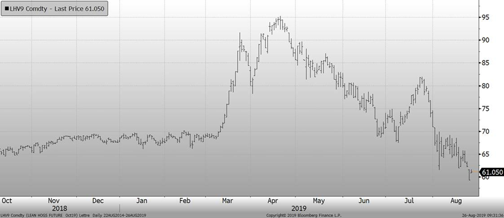 Pendant ce temps, le prix du porc aux États-Unis progresse dans la direction inverse qu’en Chine. Avec un limit down, vendredi suite à l’annonce de la Chine qui ajoutera 10% de taxe sur le porc américain, le prix des contrats a atteint un nouveau creux à la fermeture de vendredi. Suite à cela, vendredi soir, Trump annonçait une augmentation des taxes sur les importations chinoises en réponse à la Chine. En conséquence, les marchés financiers ont ouvert dimanche soir en panique ce qui n’augurait pas bien pour le marché du porc également. Toutefois, on ne peut rien prendre pour acquis avec Trump qui a annoncé durant la nuit que la Chine l’a contacté afin de reprendre les négociations… bref, en moins de 24h, on passe de la panique à l’euphorie sur les marchés financiers ce qui rend la climat très incertain. Aussi, pendant le G7 ce weekend, le Japon et les États-Unis ont annoncé d’importants avancements dans leur discussion sur le commerce ce qui pourrait mener à un nouvel accord qui serait notamment favorable pour les exportations de porc américain. Sur la « réconciliation » des États-Unis avec la Chine ainsi que l’accord avec le Japon, le marché du porc a ouvert à la hausse de 2.5 cents/lb ce matin sur octobre. Notez que la limite est de 4.5 cents/lb aujourd’hui.