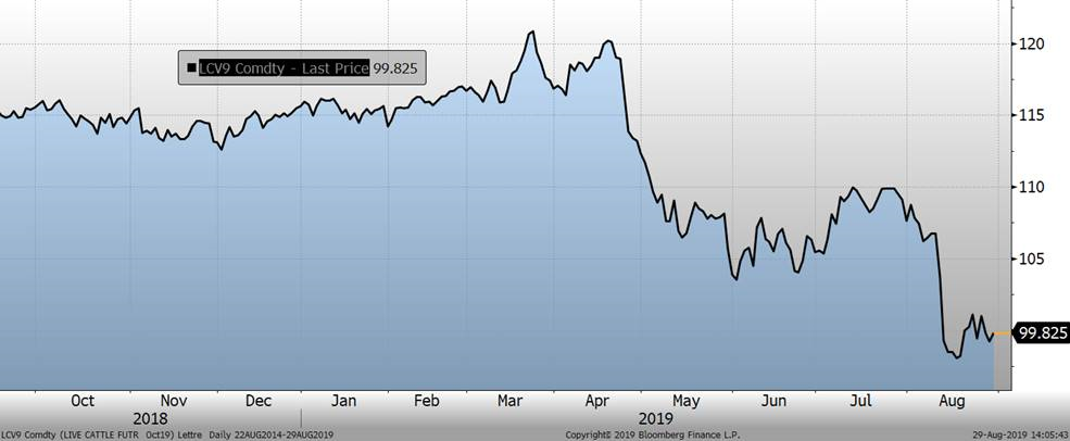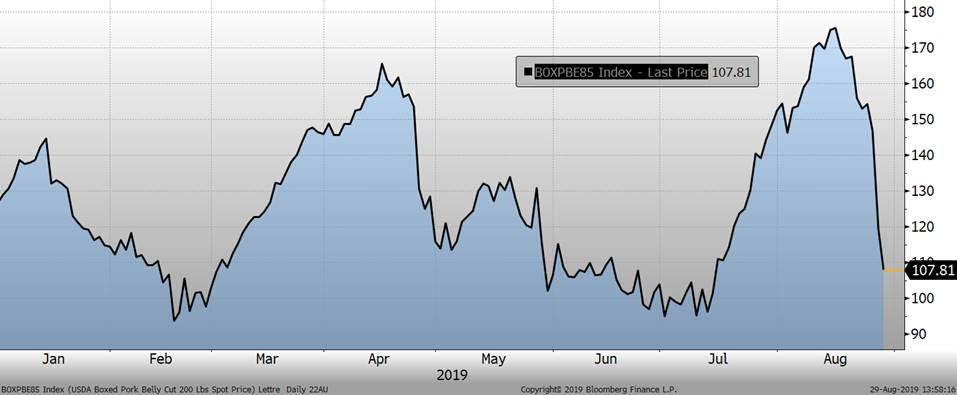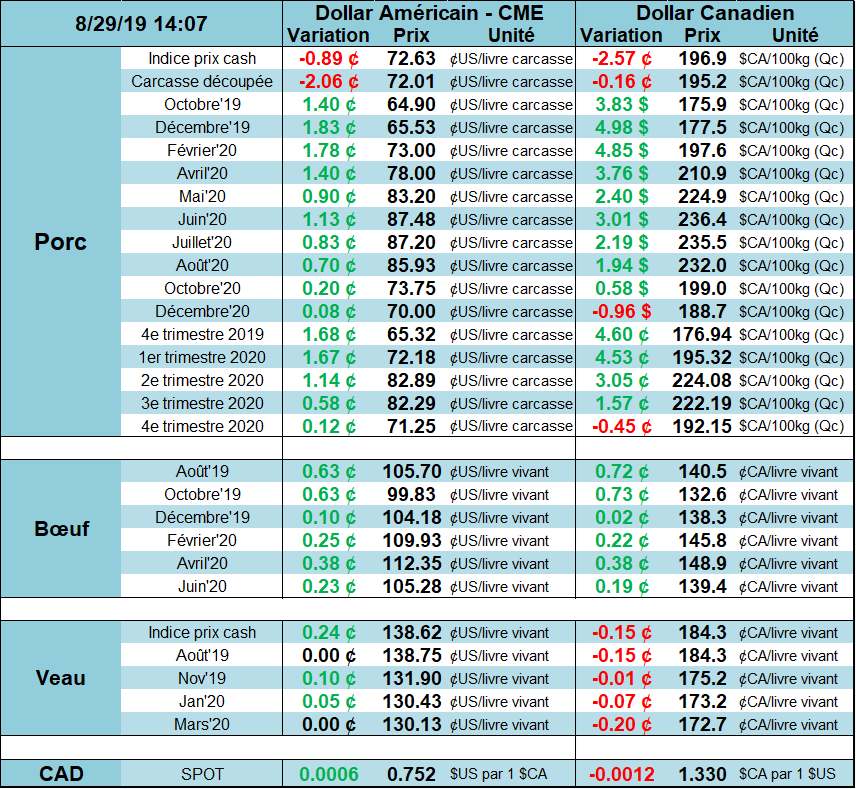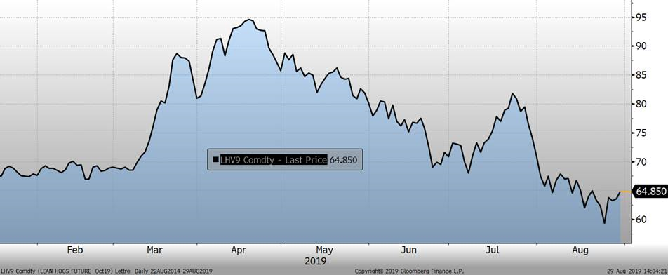 Parallèlement au phénomène de baisse de la découpe, le prix au comptant entreprenait sa baisse saisonnière avec quelques jours de retard. Le prix au comptant se situe à $70.23 USD / 100 livres. Pourtant, il est intéressant de mettre de l’avant le rythme d’abattage puisque plusieurs analystes s’attendent à une catastrophe pour la fin de l’année et croient à une explosion du nombre de porc mis en marché durant les 4 derniers mois de l’année. Depuis le 27 juillet 2019, les données d’abattages hebdomadaires par rapport à 2018 sont les suivantes : +3.05%, -0.3%, 0.13%, 6.1% et 1.44% la semaine dernière. Pour la semaine en cours, on se situe à 1.93%. La catastrophe sera-elle évitée si on suit cette tendance? L’an dernier, les creux saisonniers avaient été atteints durant la première semaine du mois de septembre, mais la baisse des prix avait débuté en juin. Peut-on s’attendre à voir des creux vers la fin de septembre cette année?