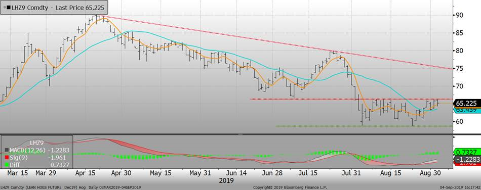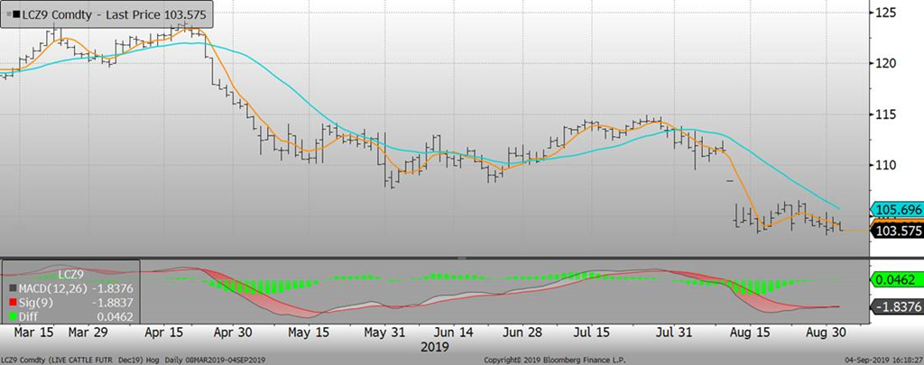 L’idée que le marché des contrats à terme essaie d’anticiper la tendance du prix au comptant des prochains mois fait son chemin parmi les négociants. En effet, presque tout le monde s’attend à ce que le prix au comptant continue sa lente glissade amorcé en août suite à l’incendie de l’usine de Tyson. On pensait que l’industrie allait supporter les producteurs et l’élan s’est manifesté jusqu’à tout récemment, mais on sent craquer les bonnes intentions pour laisser la place à une certain avarice. Le prix au comptant au Texas qui se situait à $105/106 la semaine dernière s’établissait plutôt à $102 /103 cette semaine. Les contrats d’octobre se transigent à 98.95 USD /100 livres cette semaine. Ceci se compare à $111 au début du mois d’août. La beauté du marché demeure tout de même la bonne demande du marché intérieur américain. La fin d’été qui se prolonge pourrait considérablement aider les ventes de viande de bœuf dans les supermarchés. Il est certain que le coût élevé de cette viande pourrait ralentir la demande ainsi que le manque de confiance des consommateurs envers l’économie américaine.