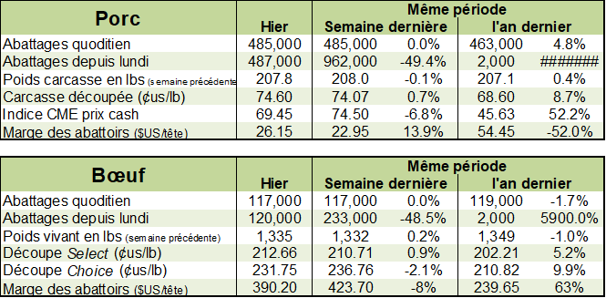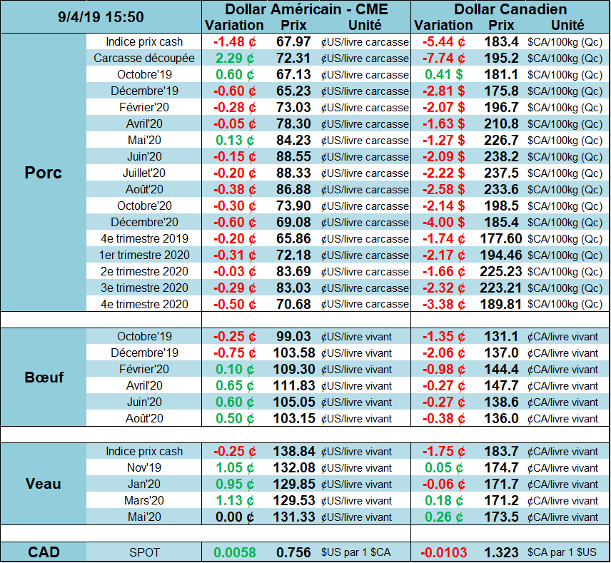 Un mot sur le dollar canadien qui reprend de l’altitude. La réunion de la Banque du Canada s’est terminée avec une conclusion qu’une baisse de taux d’intérêt n’était pas envisagée pour l’instant. Le gouverneur Poloz a réitéré sa confiance dans l’économie canadienne, mais il demeurait alerte quant aux soubresauts de l’économie mondiale. Ainsi l’écart de taux d’intérêt entre les États-Unis et la Canada continue de se rétrécir comme peau de chagrin. Ce phénomène devrait normalement signaler une hausse de notre devise face au dollar US. Cette hausse, si elle devait se produire, diminuera le prix de vente des producteurs de viandes canadiens.