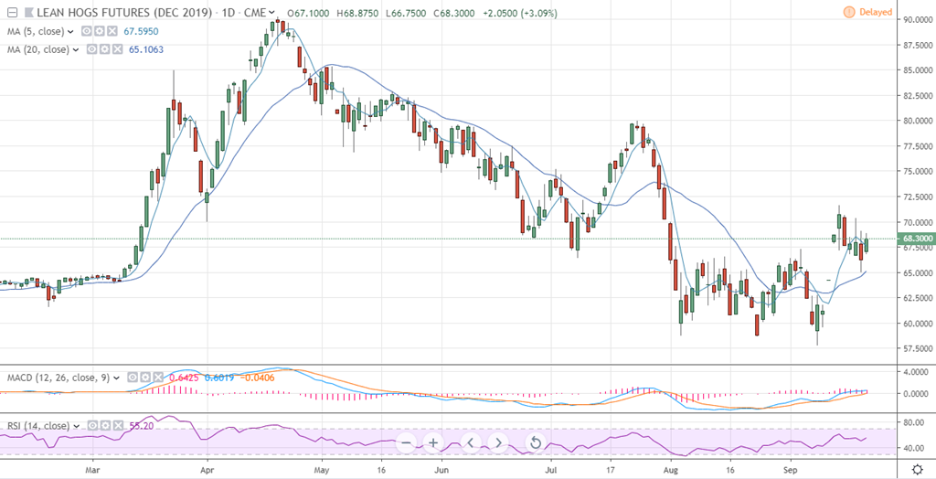 Les marché des viandes ont vacillé vendredi dernier suite à l’annonce de la non-visite d’une ferme au Montana de la part des négociateurs chinois. Il n’en fallait pas plus pour que la machine à rumeur s’emballe et fasse diminuer les prix de toutes les denrées agricoles. Ce weekend, les autorités chinoises ont tenté de rassurer tout le monde. Le retour à la maison des négociateurs chinois n’avait pas pour but de faire dérailler les négociations en cours. Conséquence, le prix du porc retourne à la hausse en ce lundi.