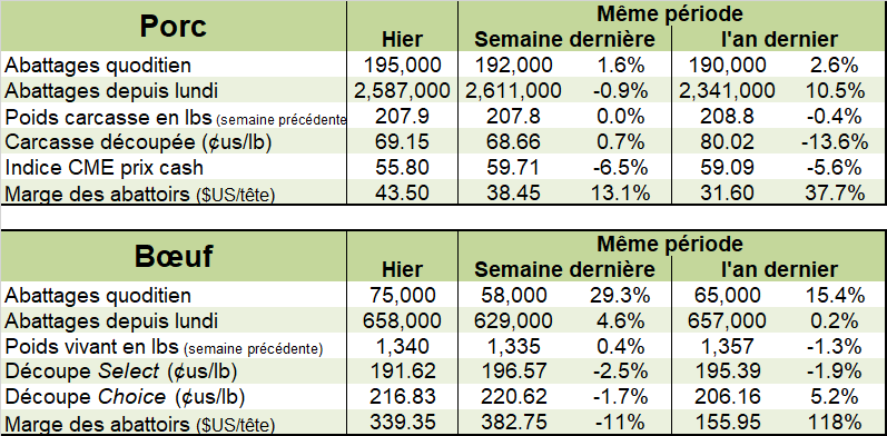 Malgré la baisse du prix des coupes de près de $4 USD / 100, le nombre d’animaux abattus ont progressé de de 5000 têtes la semaine dernière par rapport à la même semaine de 2018.