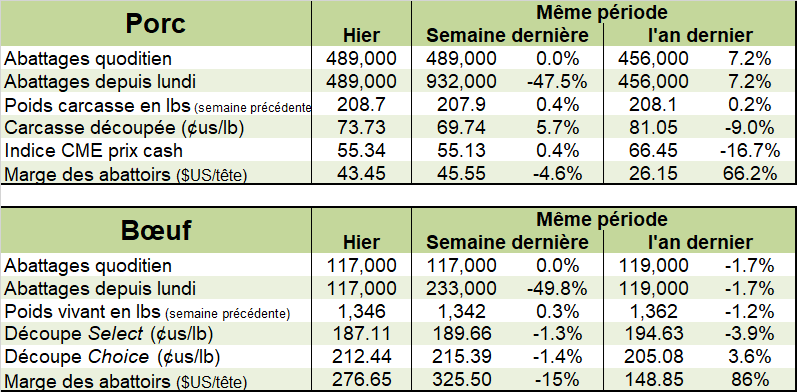 Le prix au comptant semblait se maintenir en hausse cette semaine au Kansas et Texas se situant respectivement à $103 et $104 USD / 100 livres. Ces cotations représentent des hausses de près de $2 USD / 100 livres par rapport à la semaine dernière. Le nombre de bouvillons abattus demeurent très semblable au nombre de l’an dernier, par contre les poids sont relativement plus légers ce qui provoquent une légère baisse de la production de viande.