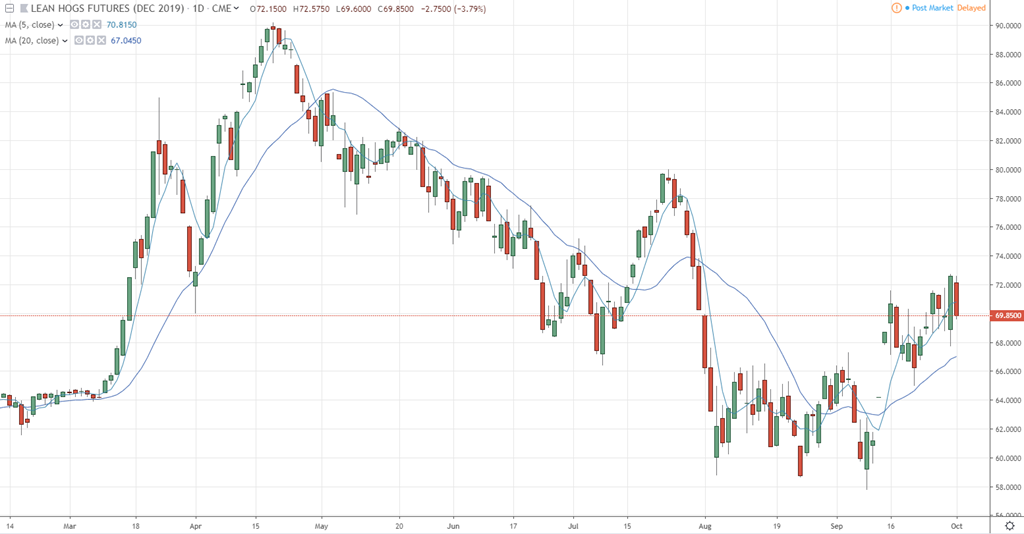 Réaction à rebours des contrats à terme de porc aujourd’hui alors que la limite à la baisse a été atteinte sur les contrats de décembre 2019. La journée d’hier semblait plutôt une anomalie, mais le marché reste le marché avec sa volatilité et ses contradictions.