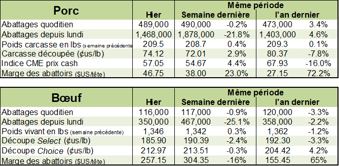 Le prix du bœuf continue son ascension et est de retour aux sommets établis en juillet dernier. Cependant, le marché semble suracheté et on va rejoindre des résistances techniques importantes, telles la barre du 120 c/lb sur avril. Sur le marché cash, le prix au Kansas était à 105 c/lb hier, en hausse comparativement à 104.50 la semaine dernière et 101.60 la semaine d’avant. Le prix cash au Texas est à 105 c/lb comparativement à 103.40 et 101.00 pour les 2 dernières semaines. En parallèle à l’augmentation du prix cash, la marge des abattoirs chute maintenant que les problèmes de logistique suite à l’incendie chez Tyson semblent résolus. La marge est passée de plus de 400 $US/tête à 250 $US/tête aujourd’hui.