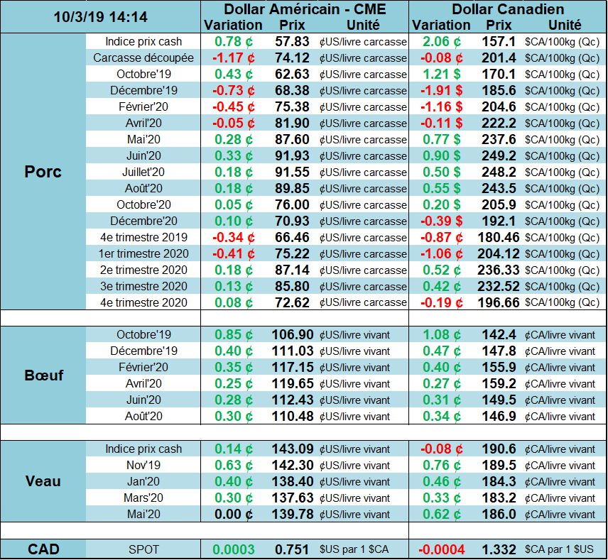 Les prix pour 2020 demeurent élevés malgré la petite correction des échéances à court terme. Le marché prévoit toujours que les exportations seront très élevées vers la Chine et l’Asie, mais les ventes à l’exportation de ce matin ne le démontrent toujours pas. La Corée du Sud a rapporté 2 nouveaux cas de PPA ce qui amène le total à 13 cas depuis le 17 septembre. Aussi, Rabobank croit que le troupeau chinois de porc sera en baisse de 55% d’ici la fin de l’année. À cela s’ajoute le Vietnam et les Philippines qui peinent à contrôler la maladie. Toutes des nouvelles qui abondent dans le même sens.
