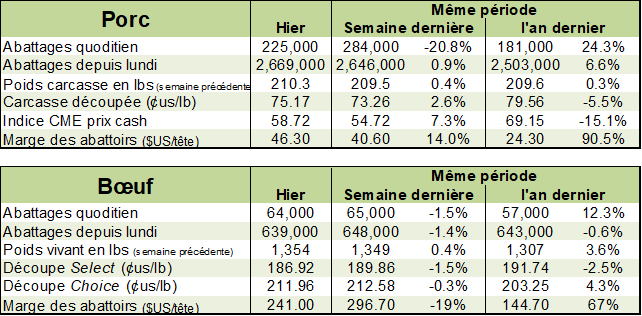 La semaine dernière, l’USDA a rapporté des abattages de 639,000 têtes ce qui représente une baisse de -1.4% et -0.2% par rapport la semaine précédente et l’an dernier, respectivement. Le poids des animaux augmente graduellement, à 1354 lbs/vivant ou 821 lbs/carcasse, c’est tout de même inférieur à l’an dernier par 16 lbs/vivant ou 10 lbs/carcasse. Au final, la production se chiffre à 523.3 millions lbs de viande de bœuf, soit 1.4% moindre que l’an dernier. Depuis le début de l’année, la production est de 20.3 milliards de livres, affichant une maigre augmentation de +0.1% versus l’an dernier.