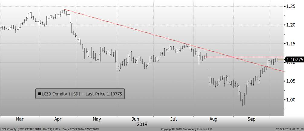 Du côté des spéculateurs, ils continuent à bouder le marché de porc malgré la situation en Chine. Entre le 25 septembre et 1eroctobre, ils ont vendu un net de 1990 contrats, réduisant leur position d’acheteur à seulement 19,465 contrats. Avec la semaine du 10 septembre, c’est la plus petite position d’acheteur que les spéculateurs détiennent depuis l’euphorie du mois d’avril dernier. Au niveau actuel, il serait plus probable (à mon avis) que les spéculateurs rembarquent dans le marché du porc advenant des signaux techniques très positifs… il suffit juste que le marché retombe dans une tendance haussière grâce aux anticipations des ventes vers la Chine.