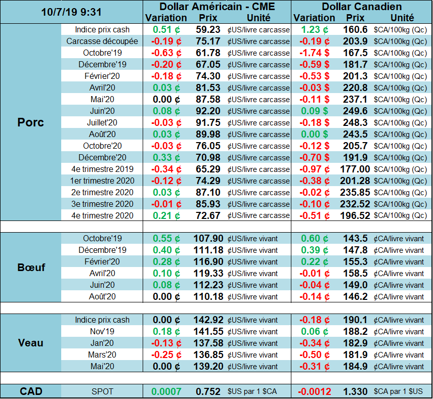 La semaine dernière, les abattages de porc étaient de 2.67 millions têtes, un record en 2019 ainsi qu’un record pour cette période de l’année. Ça donne un avant-goût des abattages qui pourraient facilement surpasser 2.7M têtes/semaine à la fin de l’automne. C’est pratiquement 6.8% de plus d’animaux que l’an dernier. À cela s’ajoute le poids des carcasses qui accélère rapidement à 210.3 lbs/carcasse comparativement à 209.6 lbs l’an dernier. En somme, la production de viande de porc était de 561.4 millions de livres, en hausse de 7.1% comparativement à l’an dernier. C’est beaucoup de viande!! Depuis le début de l’année, la production de porc est de 20.5 milliards de livres, en hausse de +4.1% versus l’an dernier.