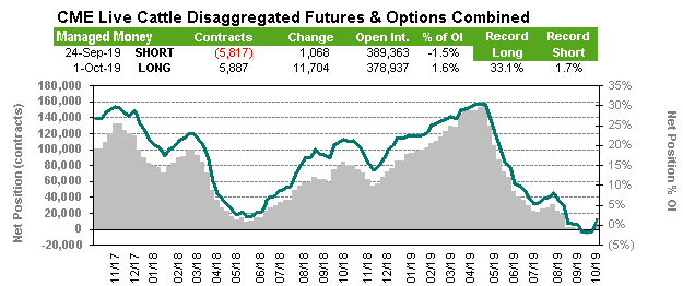 Pour l’une des rare fois depuis le printemps dernier, les spéculateurs reprennent confiance dans le marché du bœuf en achetant 5,887 contrats la semaine du 25 septembre au 1er octobre. Il faut dire qu’après l’annonce de l’incendie chez Tyson, les spéculateurs ont lancé la serviette et avaient pratiquement tout liquidé. En septembre, le spéculateurs avaient même atteint une position nette vendeur, une première depuis que le CFTC répertorie les données. À partir du niveau actuel et considérant la tendance haussière qui s’est installée depuis quelques semaines, il ne serait pas surprenant de voir les spéculateurs reprendre leur position d’acheteur dans le marché du bœuf.