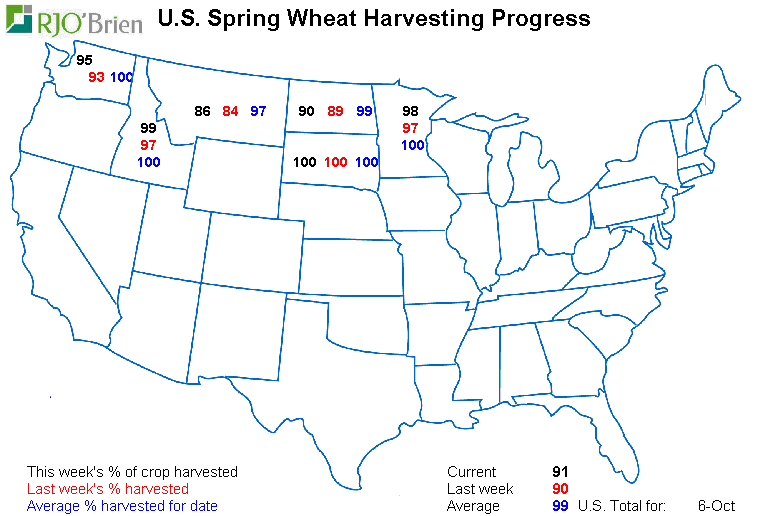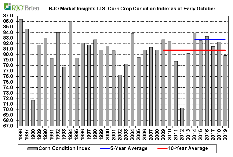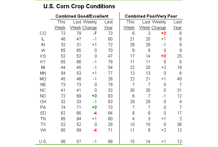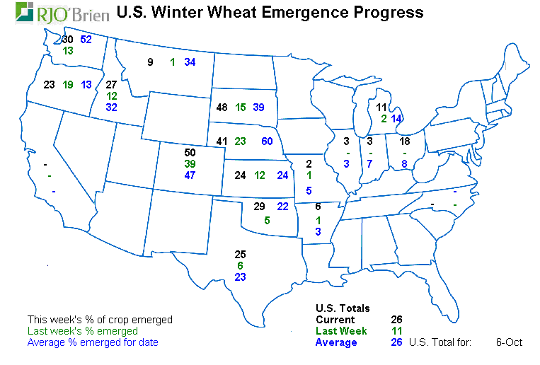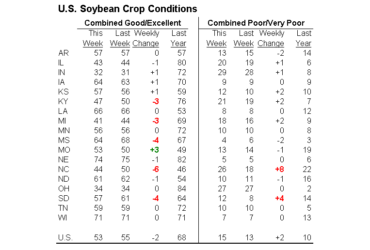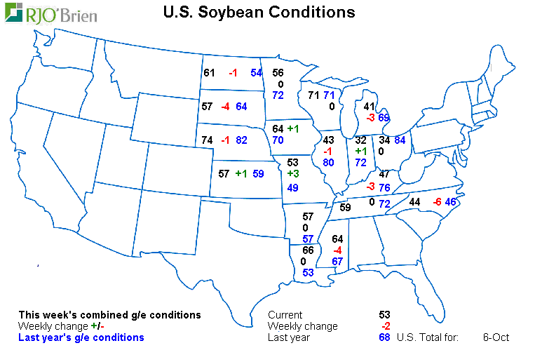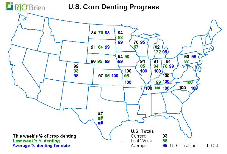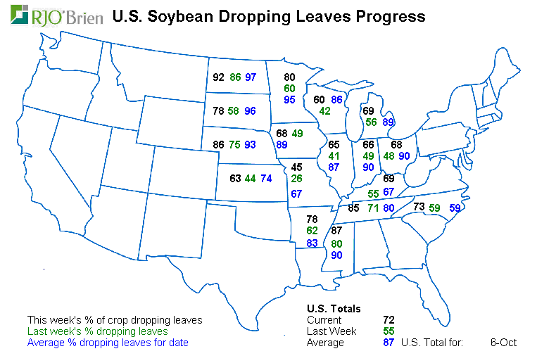 Départ très slow des récoltes. Pour plein de raisons évidentes! Premièrement vu que ça été semé tard, la récolte a pas mal été en retard toute l’année… Ça prend pas la tête à Papineau comme dirait devine-qui…. semis, levée, croissance, maturité, etc.. c’est bien normal que la récolte se fasse aussi plus tard qu’à l’habitude! Aussi, la météo n’est pas favorable, il a mouillé toute la semaine passée et donc le progrès a été minime passant de 11% à 15% de récolté. Avec les températures froide qui s’installent, le risque de gel est plus important et certains endroit n’arriveront pas à maturité complète. Dans l’ensemble du Midwest, le maïs est essentiellement denté (93%) mais la maturité totale est juste à 58%, un chiffre beaucoup plus bas que le 85% habituel à ce temps ci de l’année! C’est difficile à quantifier l’impact sur le rendement sur l’ensemble du Midwest, mais le retard actuel et le temps froid est plus un facteur à faire baisser le rendement. De combien? Je ne le sais pas. Pas sûr que l’USDA le sait tant que ça, mais c’est eux la référence pareille.