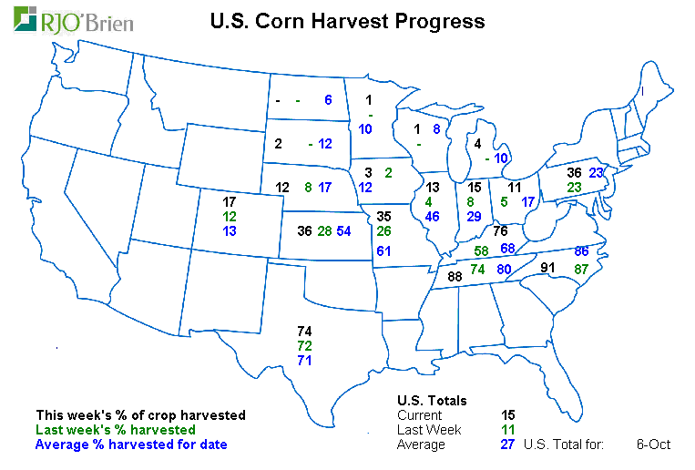 - Maïs: récolté à 15% vs 33% l’an passé ou 27% en moyenne